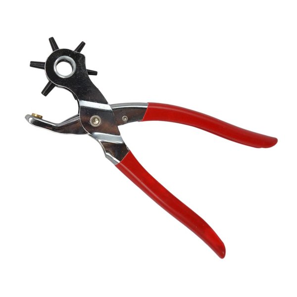 Alicate Vazador com Cabeça Giratória, equipado com 6 furadores de diferentes tamanhos, ideal para perfurar couro, correias, cintos e materiais de artesanato. Uma ferramenta prática, resistente e indispensável para quem trabalha com customização.