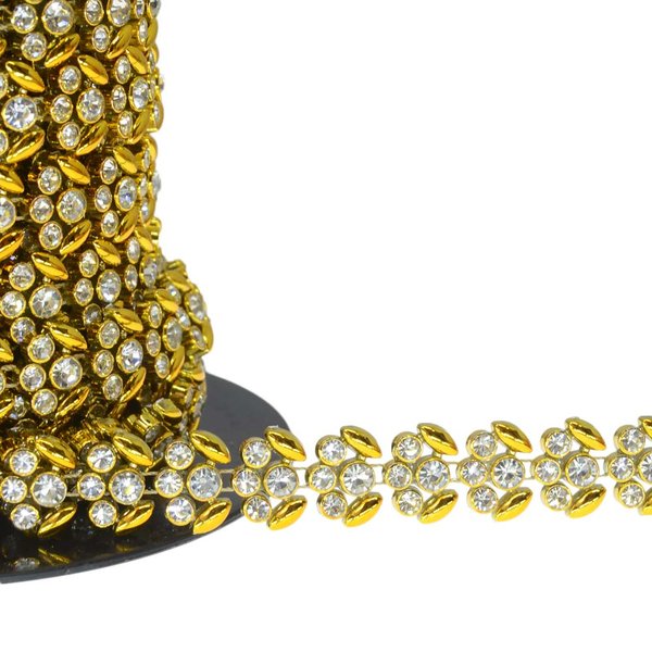 Pérola ABS 14mm Dourado/Cristal em material de alta qualidade. O acabamento metalizado garante um toque moderno e elegante. Vendido em pedaços de 30cm.