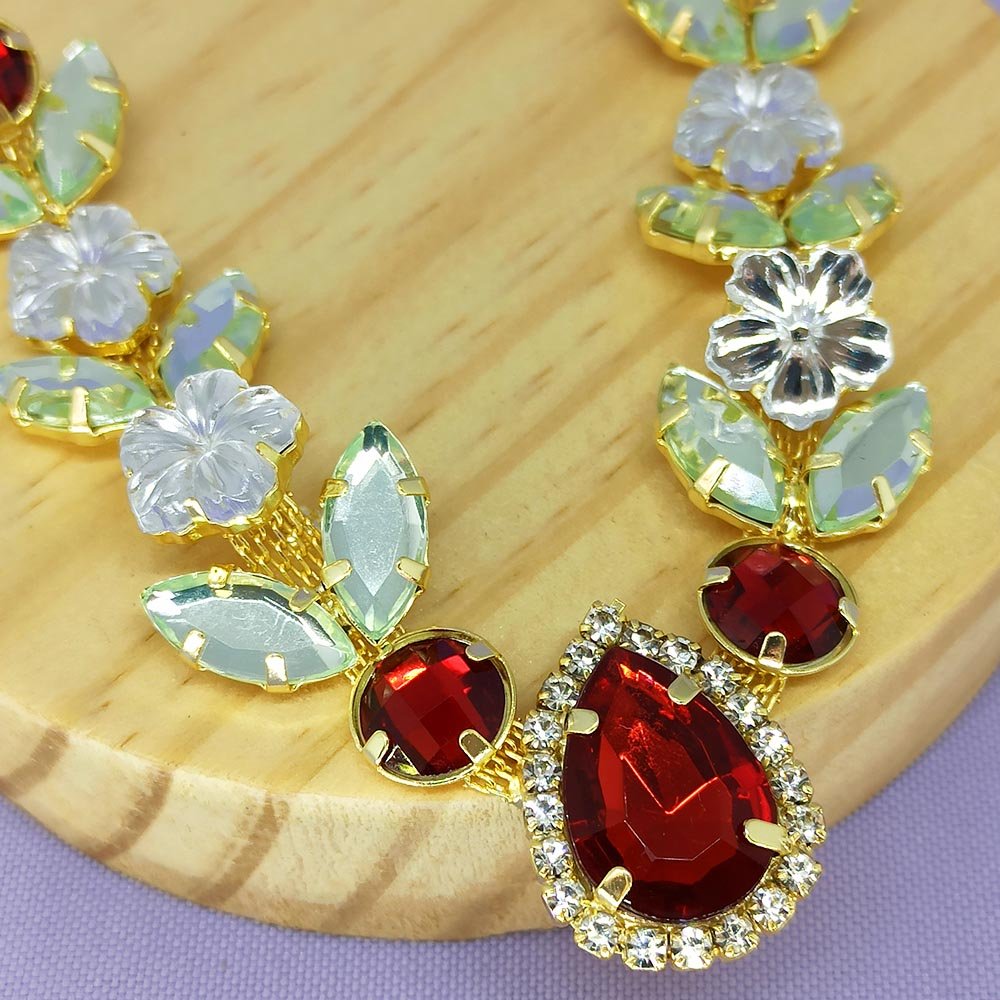 Cabedal Banhado Flores Jasmim V com Pedrarias e Florzinhas Vermelho/Verde