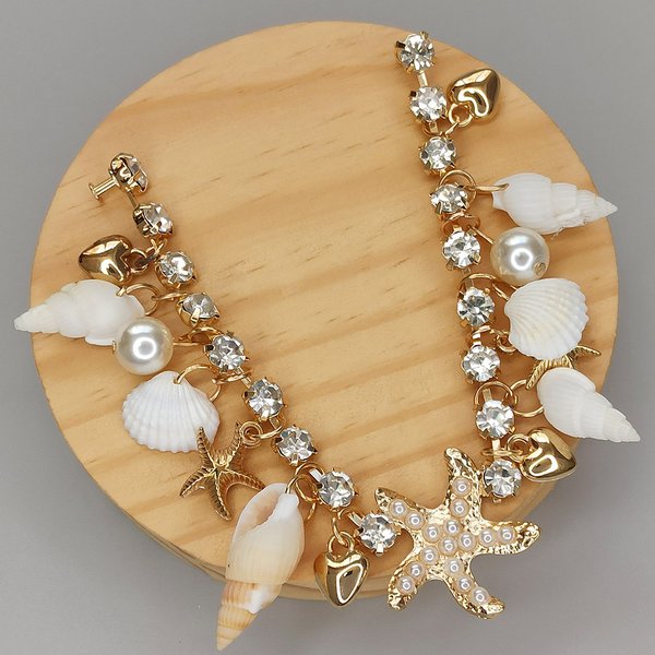 Os pingentes decorativos e os strass aplicados acrescentam movimento, brilho e destaque ao cabedal, criando uma composição equilibrada entre o rústico das conchas e a sofisticação dos detalhes reluzentes. Produzido com acabamento em banho de bijuteria, o cabedal apresenta um visual refinado.