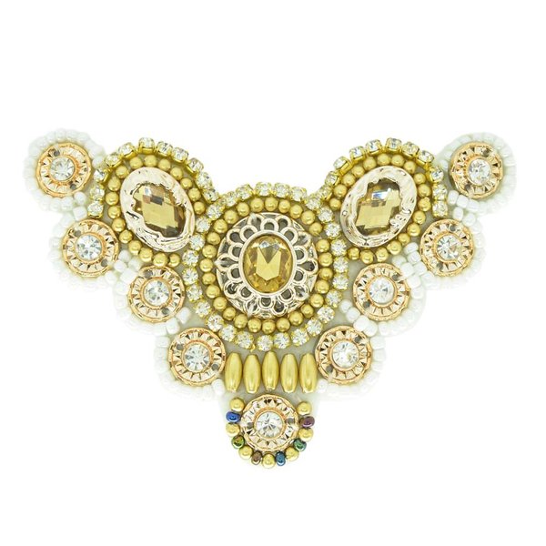 Cabedal com base de tecido com chaton, pérolas e detalhes dourados na cor branco . Modifique as correias do chinelo para aplicar este tipo de cabedal e dê um charme diferenciado e sofisticado ao seu chinelo!