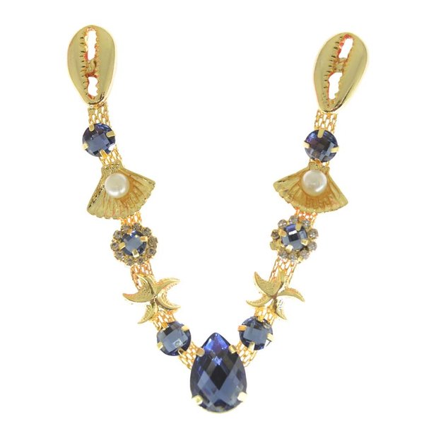 O Cabedal Marina traz elementos praianos, como estrela do mar, concha e búzios, é feito com material de excelente qualidade, produzida artesanalmente, com banho de bijuteria fina e aplicação de verniz protetor. Muito fácil de ser aplicado, é só furar, aplicar e fazer o acabamento com fio de seda ou courinho.
