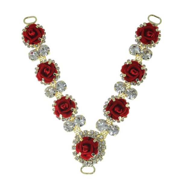 O Cabedal Rosali é diferente de tudo o que você já viu: com 7 lindas flores feitas de veludo e strass cristal de altíssimo brilho ele é perfeito para agregar luxo e charme ao seu modelo. O cabedal em formato em V é muito fácil de ser aplicado, basta fazer o acabamento com fio de seda passando pelos passantes para fixar a peça. Finalize o acabamento nas correias com strass e agregue mais valor ao seu trabalho.