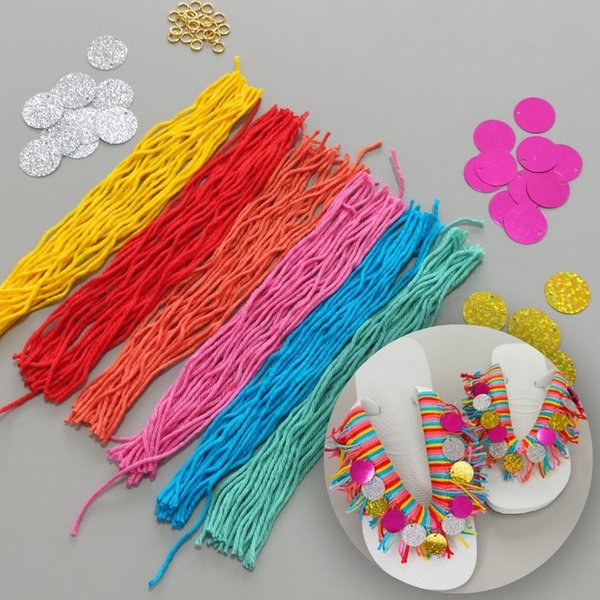 Com 240 fios em cores variadas, o kit permite criar o efeito entrelaçado e franjado nas correias do chinelo, trazendo textura, volume e um visual super moderno. As cores se misturam de forma harmoniosa, criando aquele efeito carnavalesco cheio de energia e personalidade.
