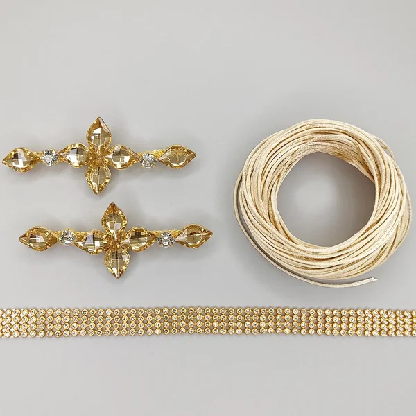 - 1 peça com 4 fileirinhas x 40cm de Manta de Strass, Ouro/Cristal – perfeita para adicionar brilho extra e destacar cada detalhe da sua criação.
