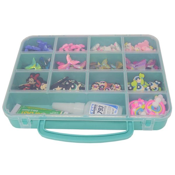 Estrutura com 14 compartimentos, alça e fechos para transporte seguro.