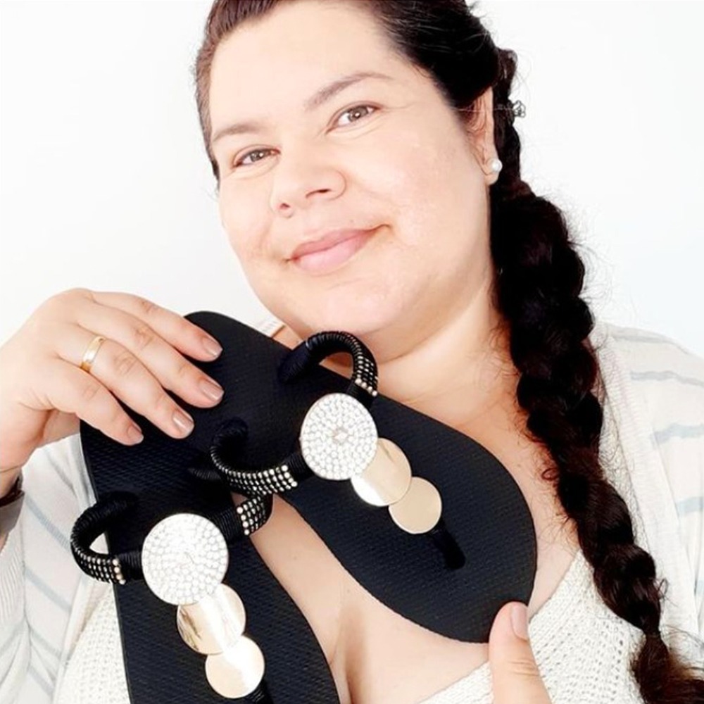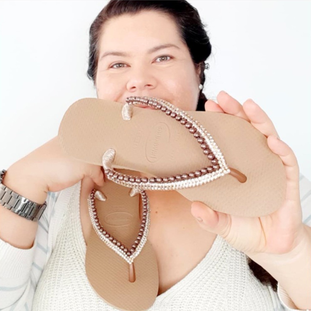 Ela se reinventou e, com o passar do tempo, decidiu buscar um diferencial! Foi então que escolheu se especializar em Customização com Pedrarias e Rasteirinhas, trazendo técnicas diferenciadas e inovadoras, provando que Chinelos Customizados também podem ser verdadeiras Joias!